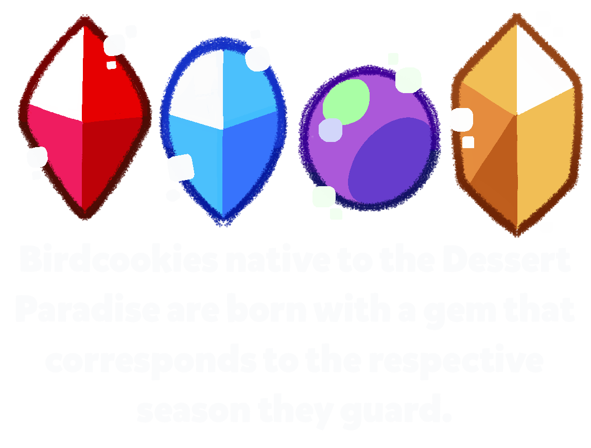 Birdcookies native to Dessert Paradise are born with a gem corresponding to their place in the Seasonal Court. Each season has their own school of magic that the Cookie specializes in since birth. Other Cookies not from the Dessert Paradise are able to learn magic at their own discretion.